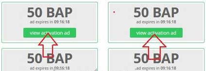 در صفحه Members home page بر روی VIEW PAID ADS کلیک و پس از آن بر روی تبلیغات 50 امتیازی(view activation ad ) کلیک کنید .هر روز برای کسب 400 امتیاز رایگان باید روی هر 8 تبلیغ activation ad کلیک کنید .(هر activation ad نیز 50 BAP به شما خواهد داد. )